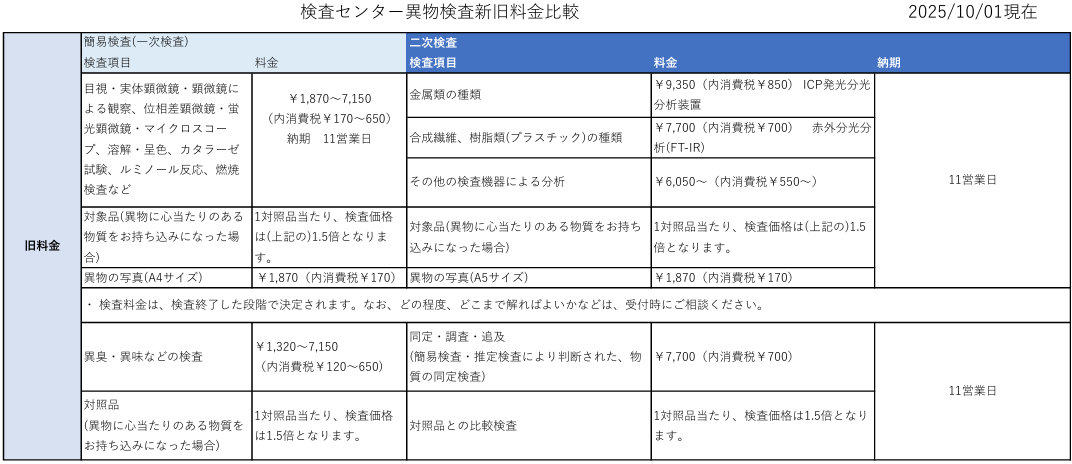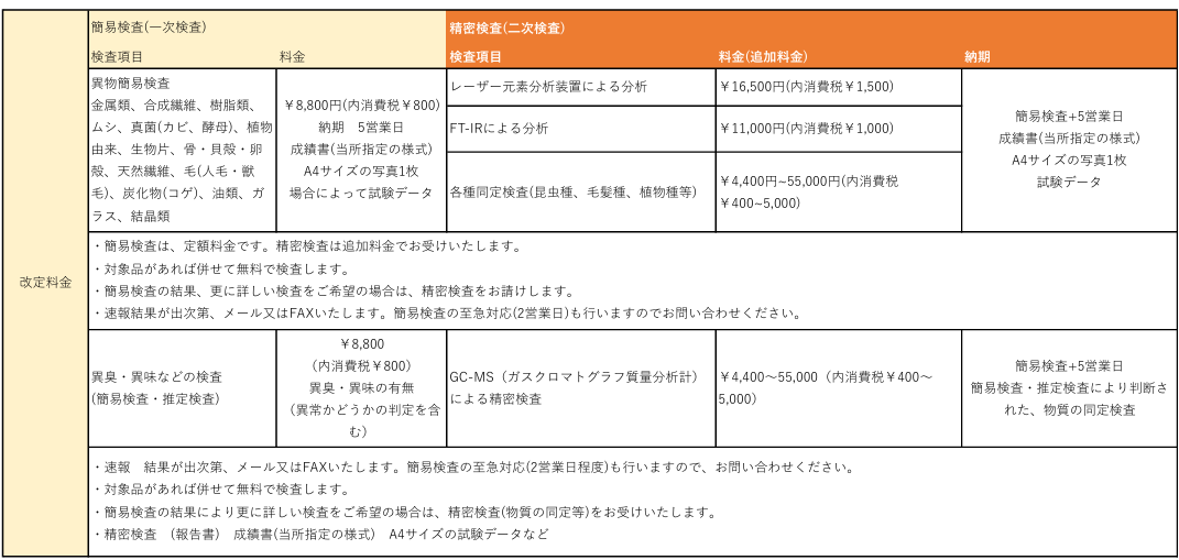 この度、食品中の異物や異臭などの異常品検査に係る料金について下記のとおり改定いたしました。